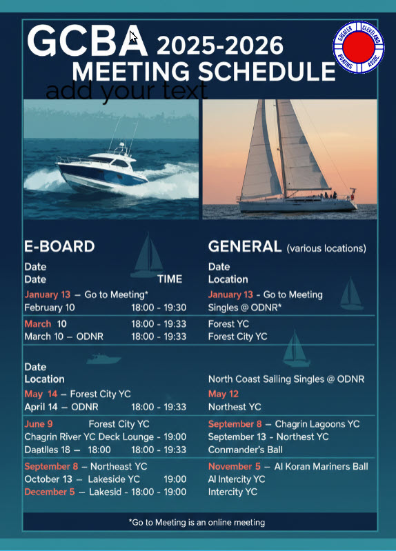 GCBA Meetings The board members of the Greater Cleveland Boating Association look forward to your participation at these meetings open to any recreational waterway user. GCBA 2025-2026 ScheduleGCBA 2025-2026 Schedule